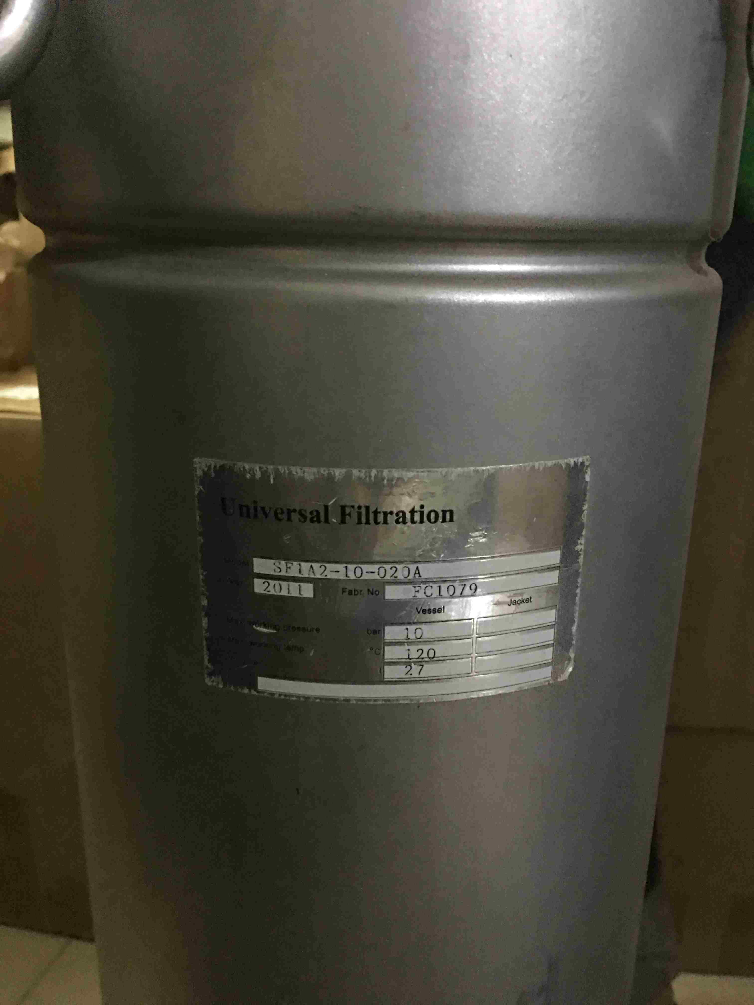 Nhà sản xuất Universal Filtration Singapore, nhà máy tại Thượng Hải - TQ Chất liệu: inox 304 (loại inox mờ, đã xử lý bề mặt cho ngành thực phẩm, dược phẩm), chịu áp tối đa 10 bar, nhiệt độ 90 độ C, Thể tích 27 lít