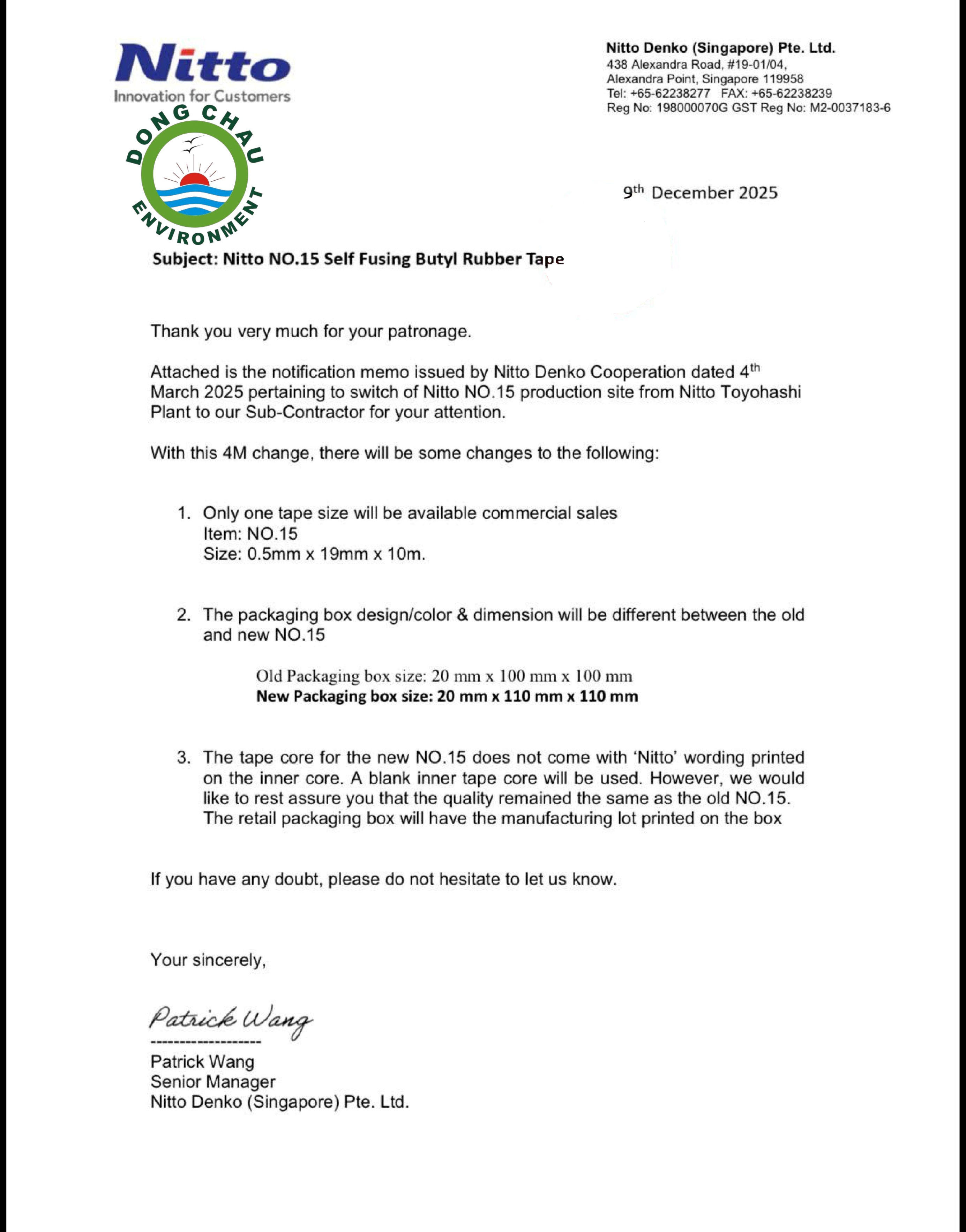 Theo thông báo từ Nitto Denko Singapore, từ tháng 3/2025, sản phẩm No.15 được sản xuất tại đơn vị gia công mới, thay thế nhà máy Toyohashi. Chất lượng vẫn giữ nguyên, nhưng có một số thay đổi đáng chú ý: